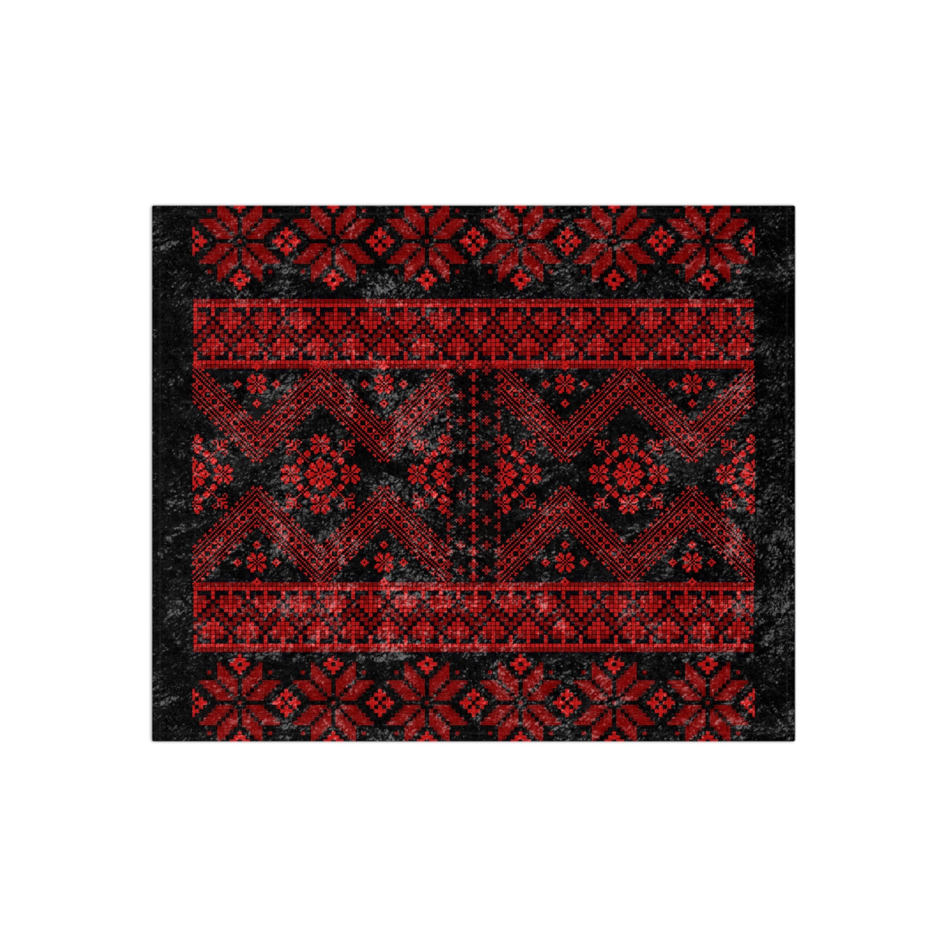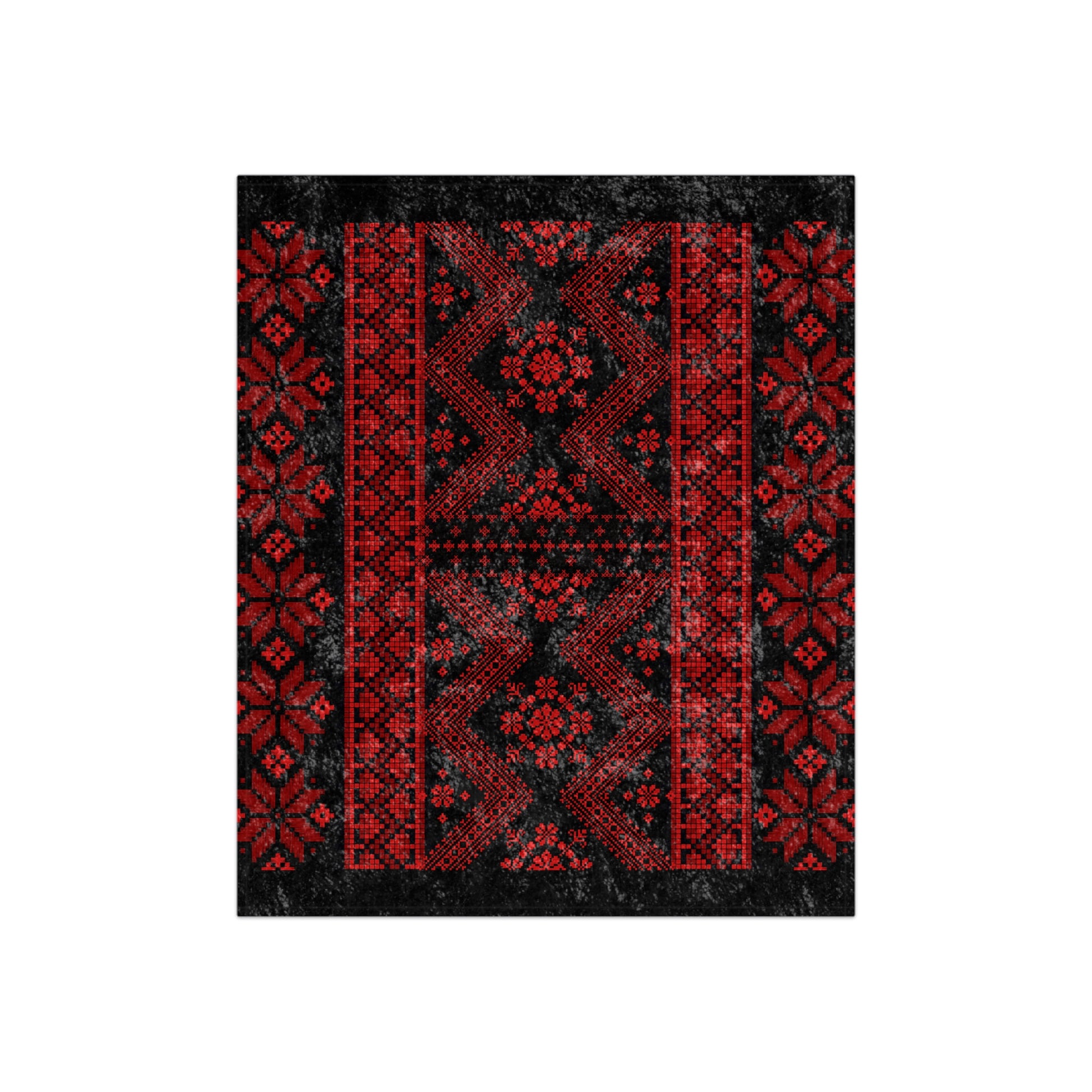 Luxurious Tatreez print black and white crushed velvet blanket, offering a cozy and elegant touch to any living space. Perfect for those who appreciate unique designs and seek comfort during chilly nights. Ideal for gifting during the holiday season or special occasions.