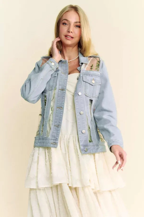 This denim jacket features front pockets and intricate embroidery of delicate floral mesh. With a true-to-size fit and no stretch, it's the perfect choice for those seeking sleek sophistication. For a more oversized look, consider sizing up.
