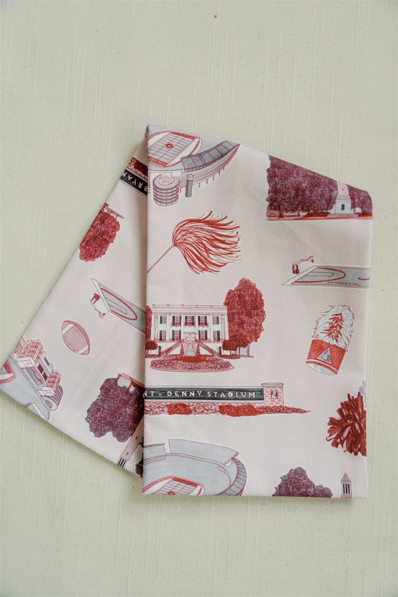 19x29 inch 100% cotton flour sack tea towel featuring an Alabama pattern of Bryant Denny Stadium, Denny Chimes, Coleman Coliseum, and more!