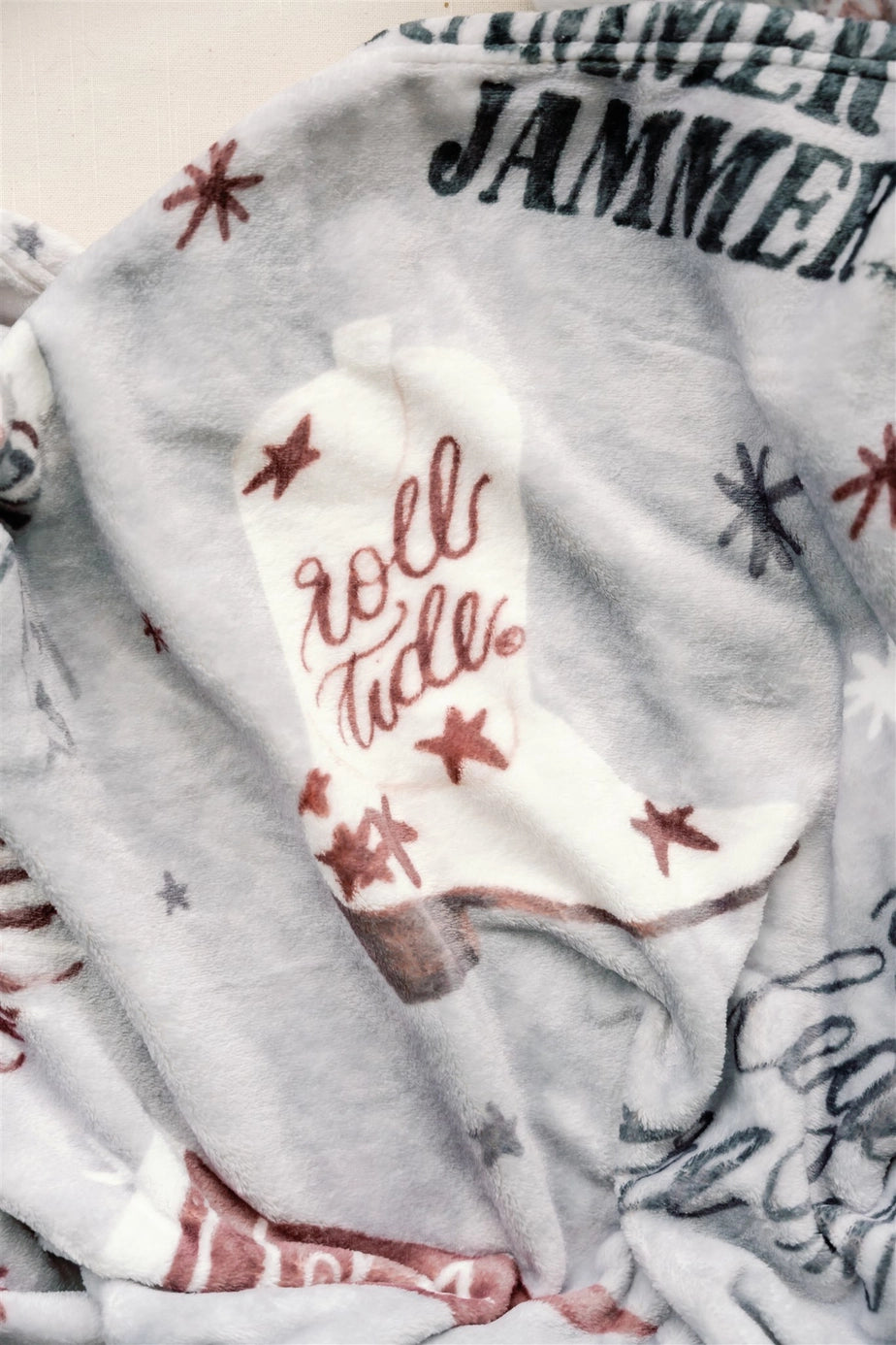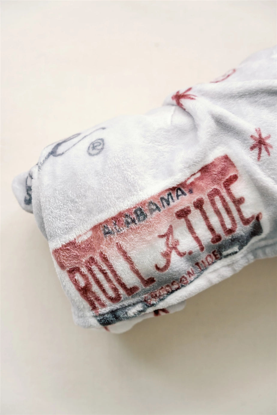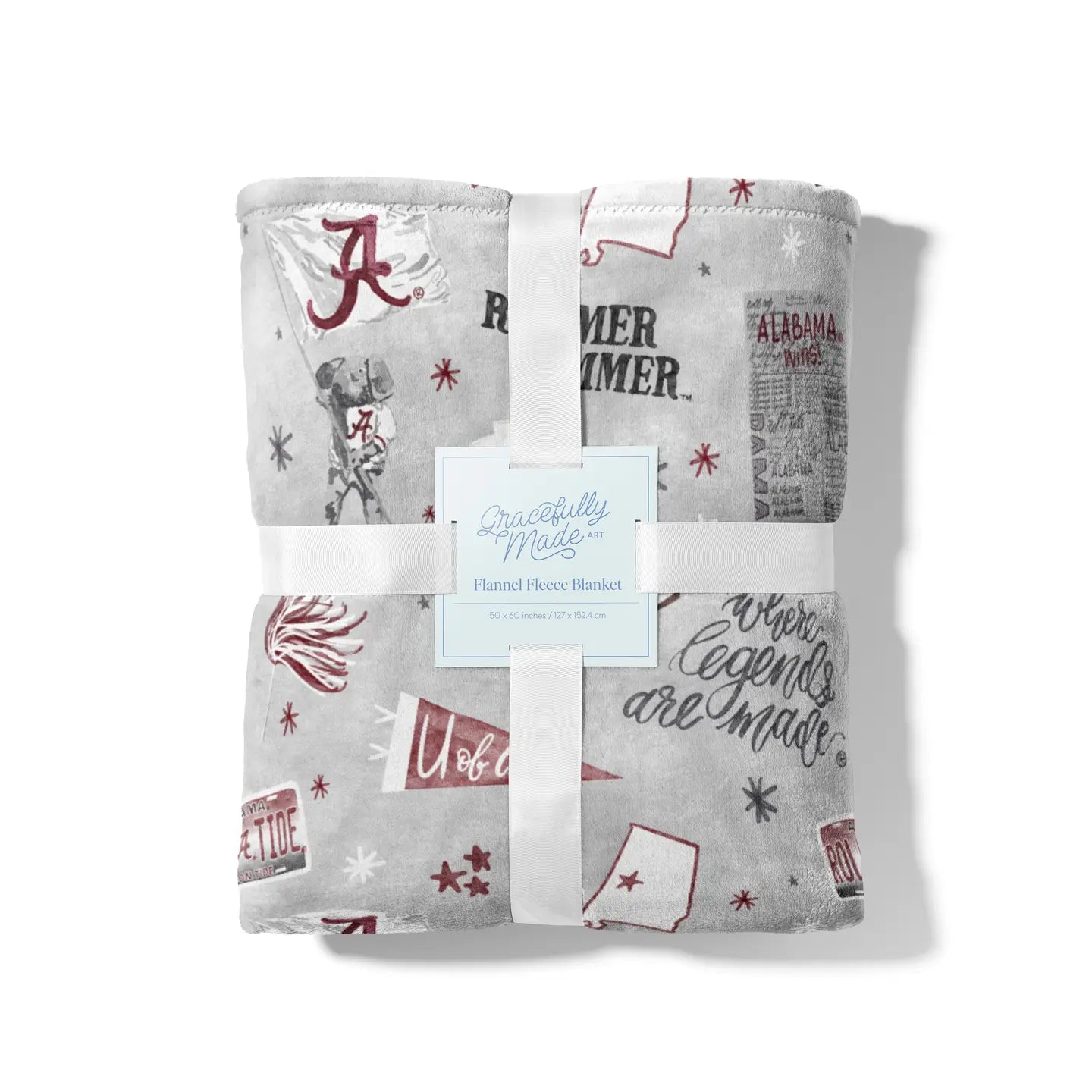 OFFICIALLY LICENSED BY THE UNIVERSITY OF ALABAMA This cozy and stylish Alabama blanket is the perfect addition to any Crimson Tide fan’s collection. Featuring unique, hand-illustrated designs with iconic symbols from the University of Alabama, this flannel fleece blanket is a tribute to the school’s rich traditions and spirited community. Whether you're cozying up on a game day or adding a touch of Alabama pride to your space, this blanket promises comfort and warmth while celebrating the legendary moments that make the University of Alabama so special. Ideal for gifting or as a personal treasure, it's the perfect way to show your team spirit! - 50 x 60 inches - Flannel fleece material - Packaged with branded tag and ribbon, as well as licensed holographic sticker